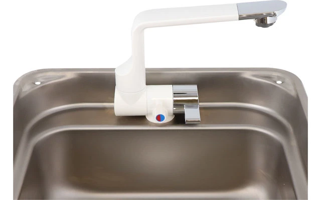 Der Wasserhahn ARONA ist eine moderne Kunststoffarmatur. Die hohe Funktionalität unterstreicht der schwenkbare Auslauf, die gut zu reinigende Oberfläche sowie der ausschraubbare Wasserauslass mit standardmäßig mitgeliefertem Reinigungsschlüssel zum Entkalken und Reinigen. Die Armatur ist druckwasserbeständig bis 1,5 bar. Der Mikroschalter (max. 3 A) ermöglicht den Einsatz in Caravan und Reisemobil.
