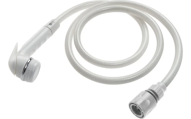 Komplett-Set bestehend aus Kunststoff-Stellbrause mit 1,5 m Kunststoffschlauch und Anschlusskupplung. Mit Schlauchverbinder passend für die Fawo Wasser-Außensteckdose (z.B.: Art-Nr. 276130) oder Gardena-Außenanschluss.
