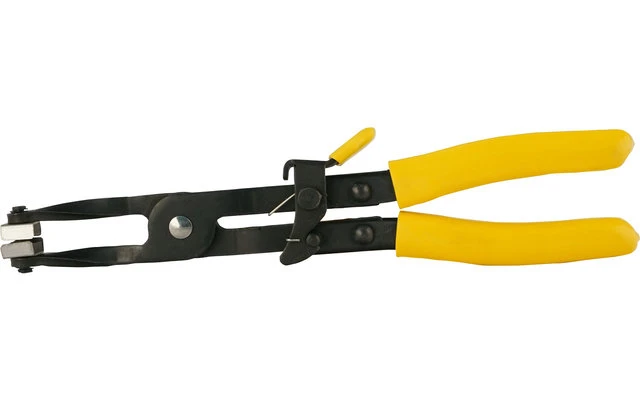 Federbandschellen-Zange mit speziellen Aufsätzen, die genau in die Führungszapfen der LILIE-Federbandschellen greifen. Mit Arretierhebel für kraftsparende Montage.